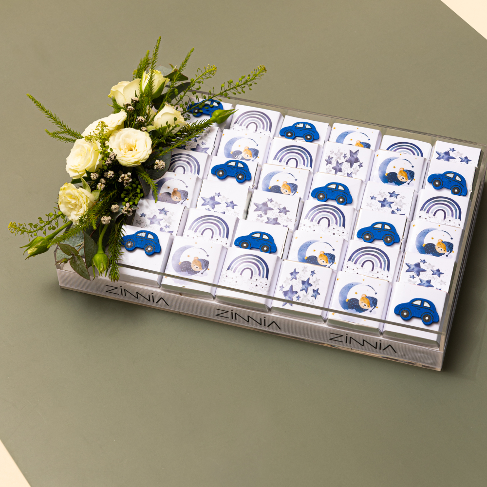 This acrylic tray, decorated with roses, contains 36 pieces of premium wrapped Belgian chocolates.