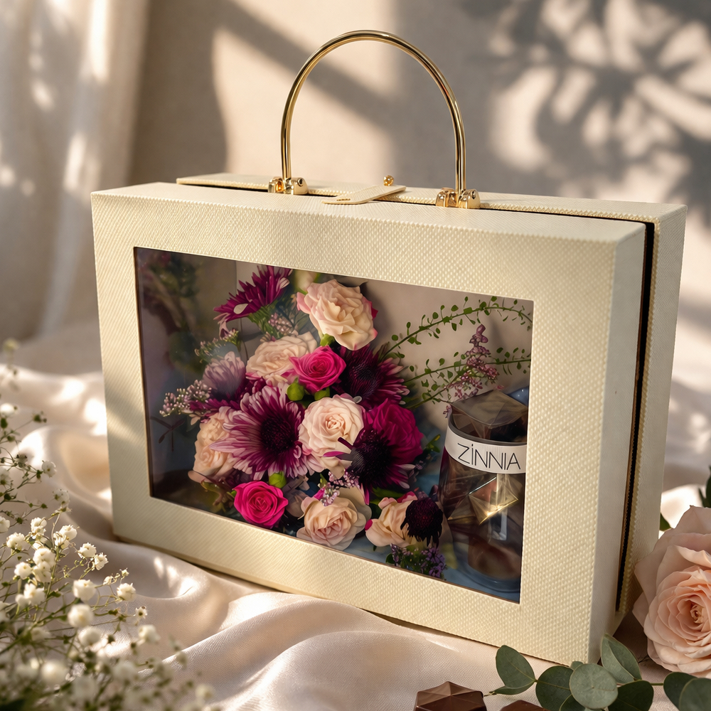 A luxurious collection featuring fresh blooms and premium chocolates elegantly arranged in a sophisticated gift box.