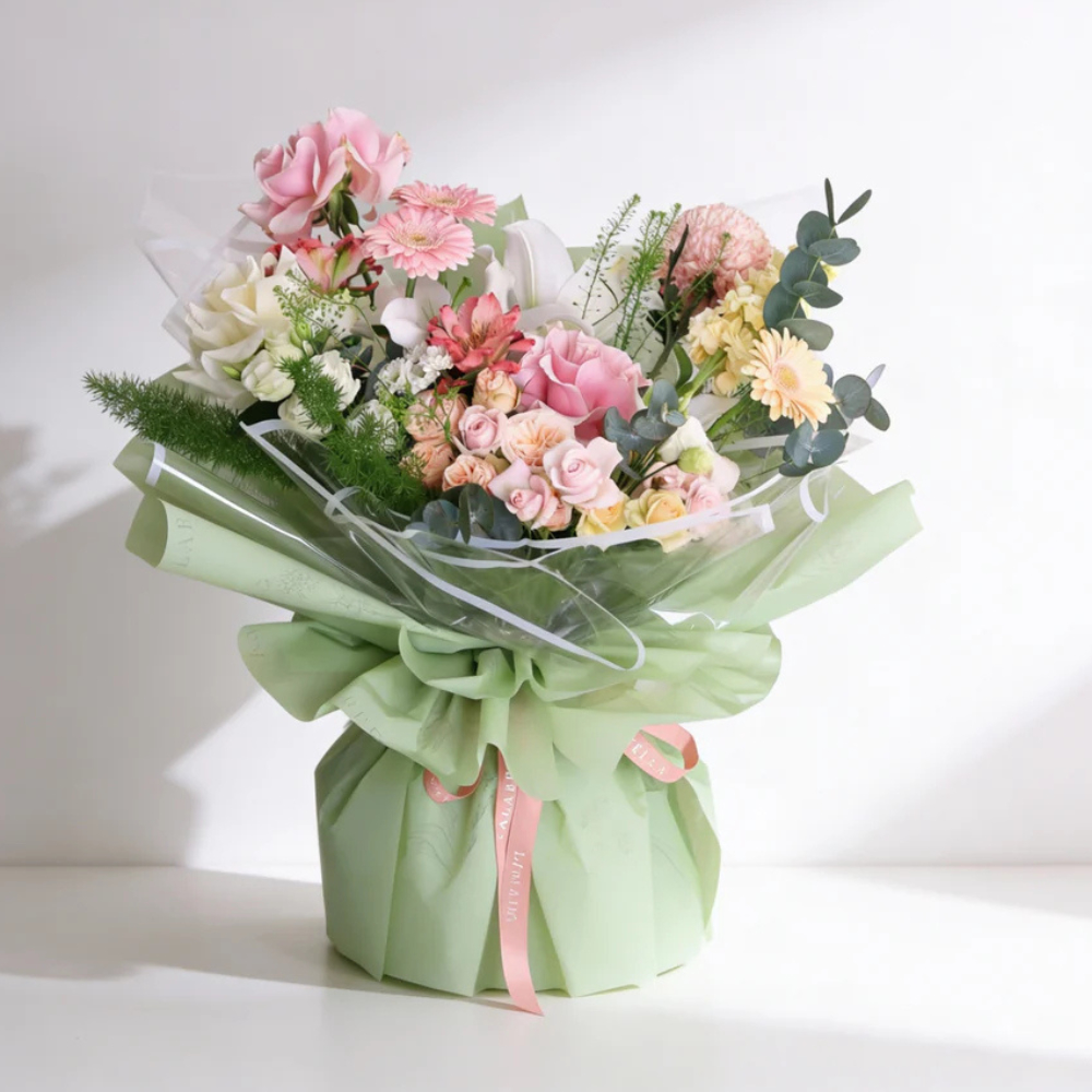 A garden-style bouquet full of character and charm, with roses taking center stage among a lively mix of seasonal blooms. The bouquet contains roses, baby roses, and gerberas.