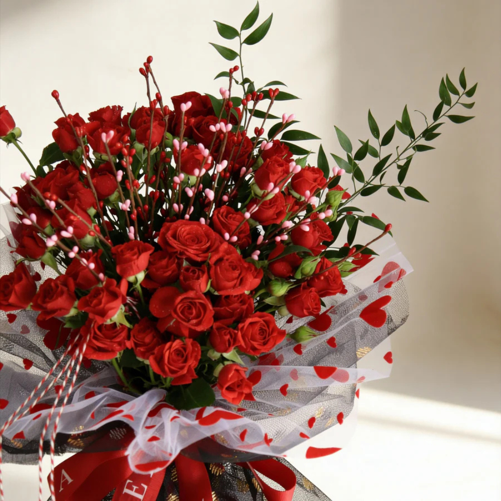 Sweep them off their feet with this stunning Love Day bouquet featuring radiant red roses, beautifully wrapped in elegant double layers of black golden polka dot tulle and romantic hearts tulle. Accented with charming heart sticks