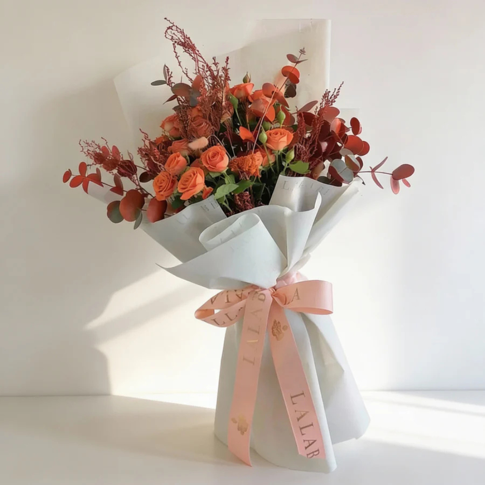 A hand bouquet of seasonal flowers in vibrant orange shades, featuring roses, beautifully arranged for a warm and lively look.