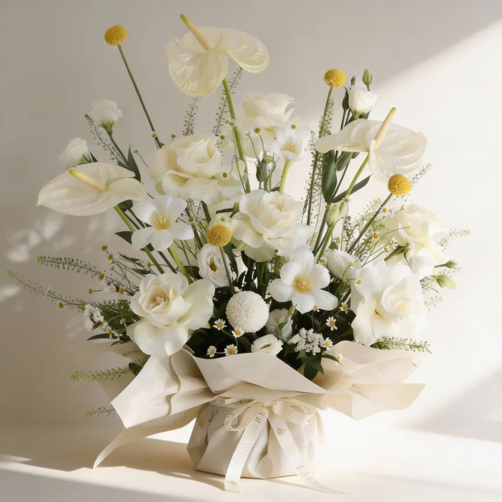 A white mixed flower arrangement, featuring tulips, roses, baby roses, and anthuriums, set in oasis foam and elegantly wrapped in paper.