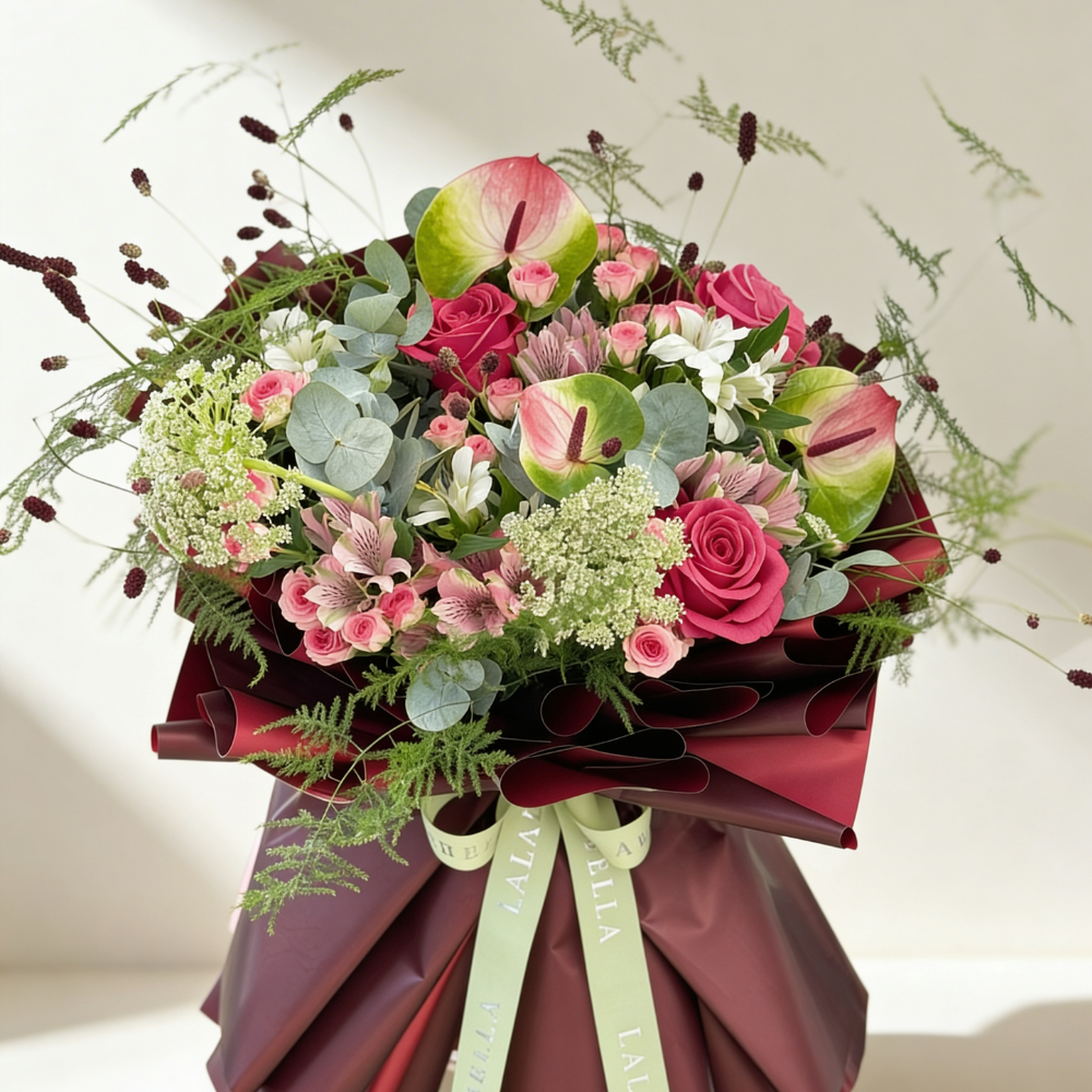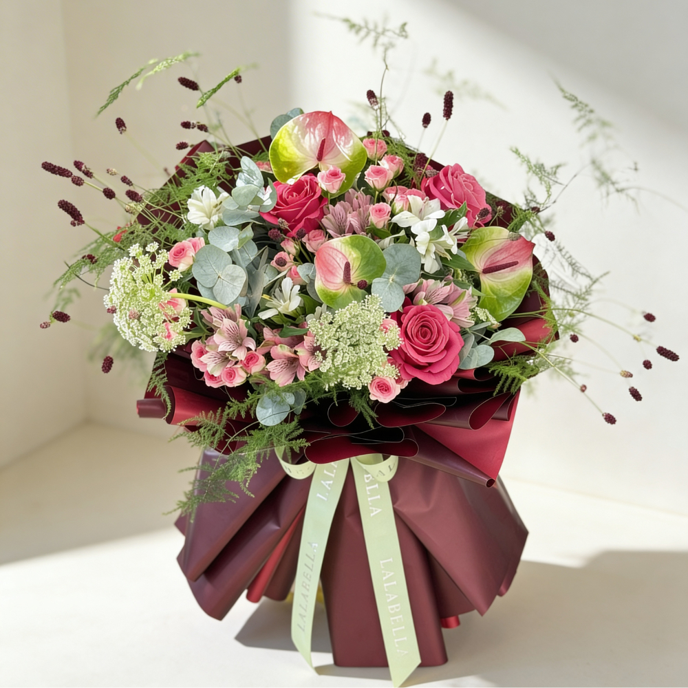 A charming hand bouquet featuring pink and white blooms with fresh touches of green, beautifully arranged for a soft, elegant look.