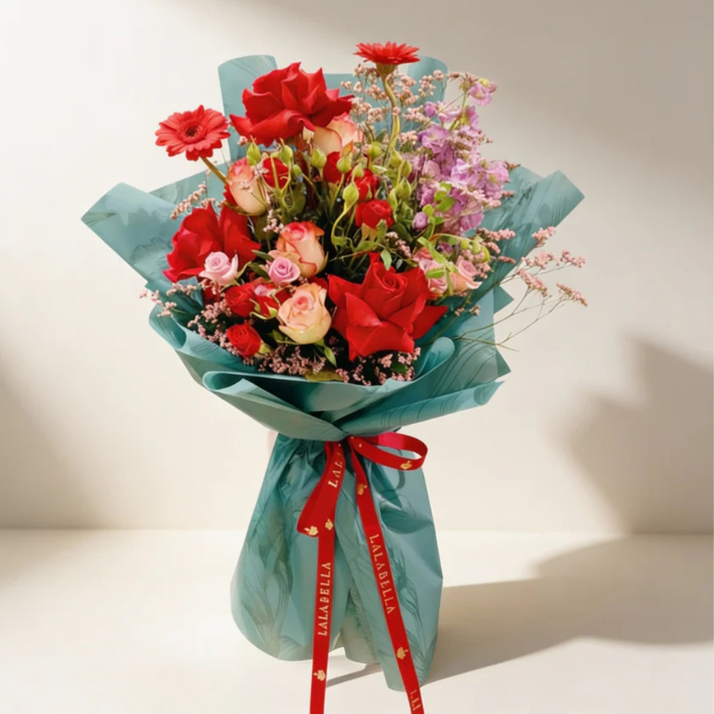Romantic red and pink roses and gerberas, elegantly wrapped and perfect for gifting.
