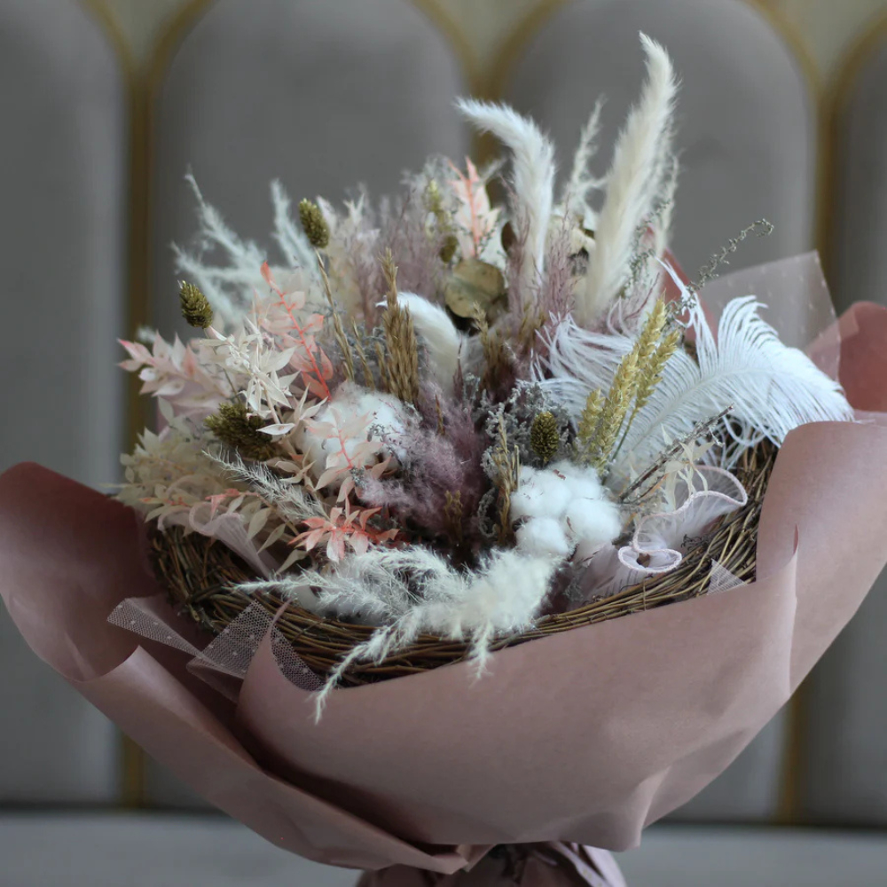 A beautiful hand bouquet of dried flowers for an everlasting loving memory.