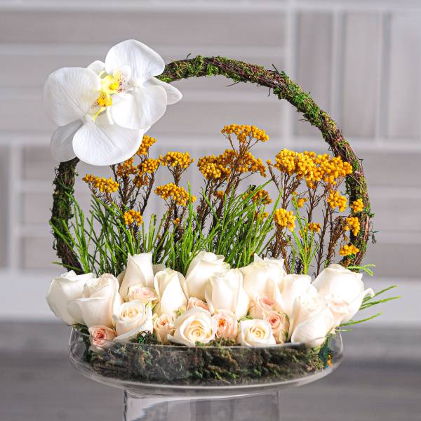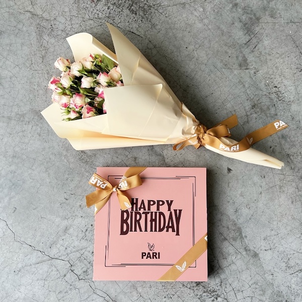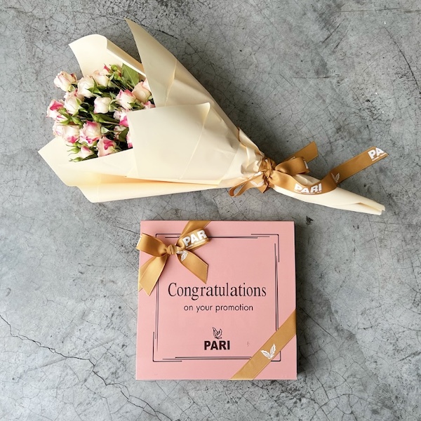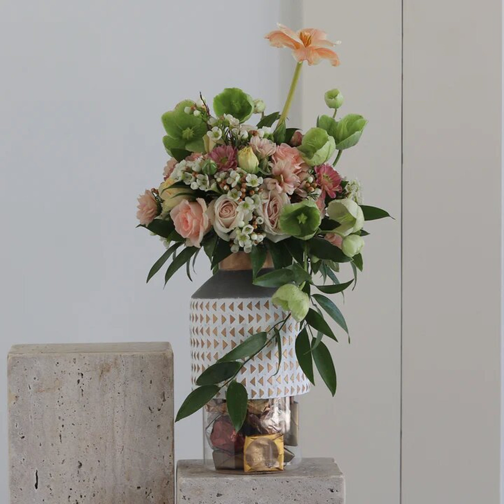 A bouquet featuring roses, tulips, and orchids with chocolates.