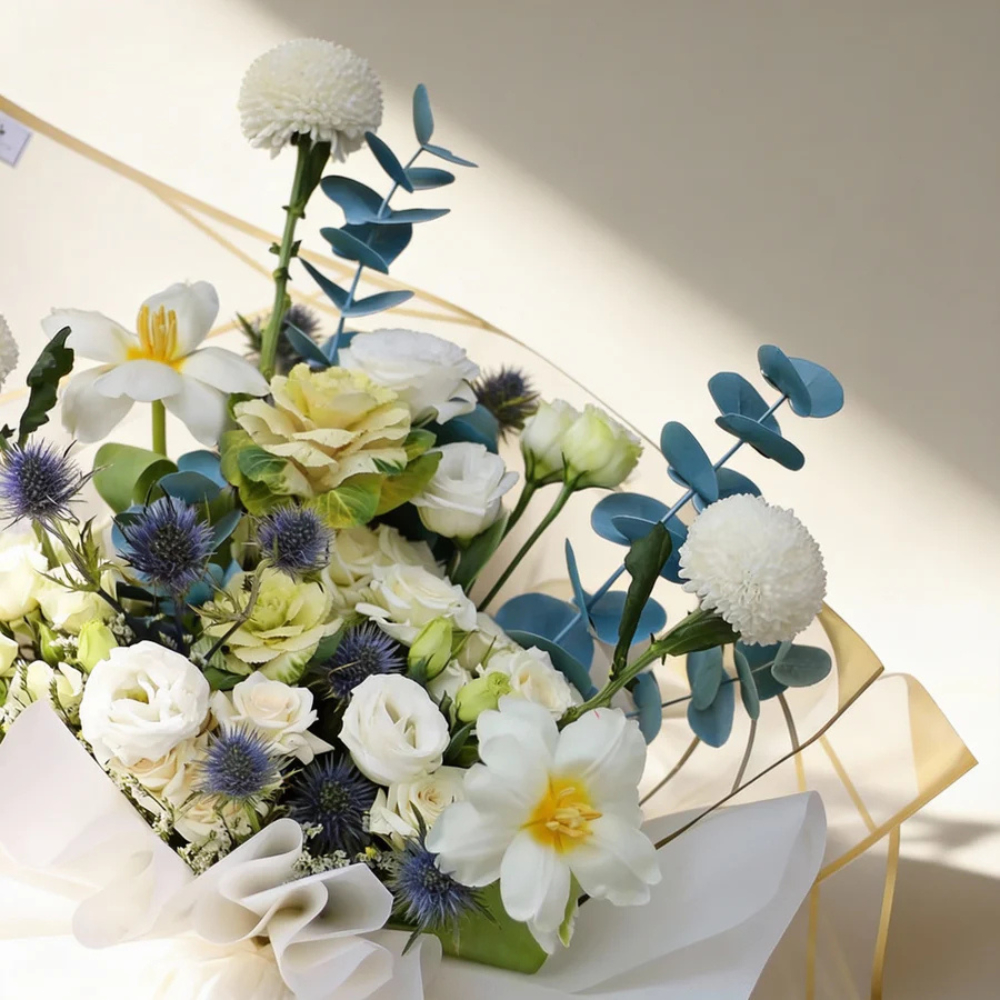 A hand bouquet of mixed seasonal flowers, featuring roses, baby roses, tulips, and chrysanthemums, beautifully arranged for a fresh and charming look.