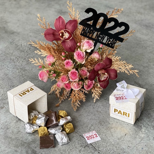 Standing bouquet consisting of roses, spray roses, hypericum and chamaparis leaves and acrylic New Year stick along with a box filled with 250 grams of assorted fine chocolates. Box size : 10cm x 10cm.