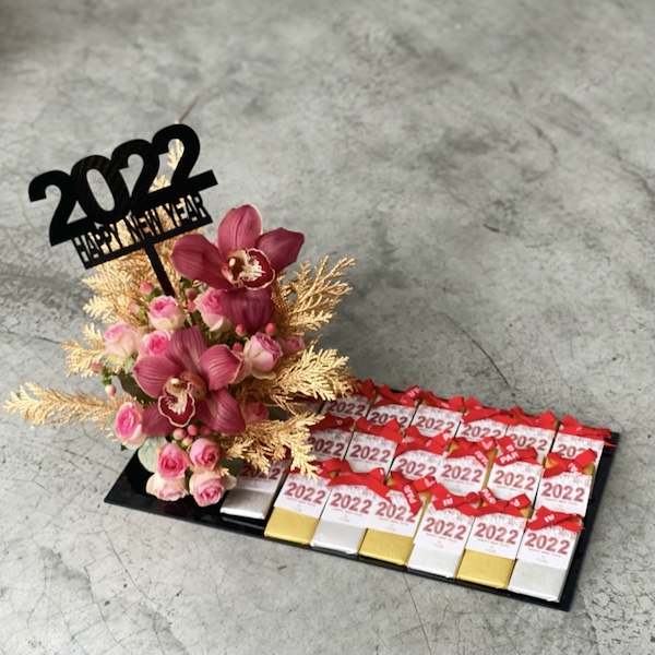 20 Plain milk chocolate bar with new years design and ribbon arranged on an acrylic tray with flowers and acrylic stick. Chocolate dimensions : 8cm x 4cm. Tray dimensions: 30cm x 18cm.