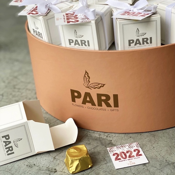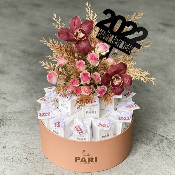 Signature cylinder box with 18 giveaway boxes with tag attached and fresh flowers . Each giveaway box is filled with one piece of chocolate. Along with acrylic stick Giveaway Box Size: 5cm x 5cm.