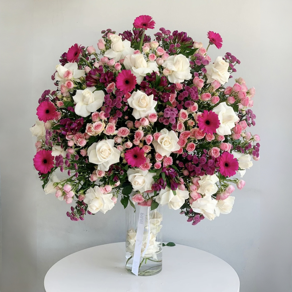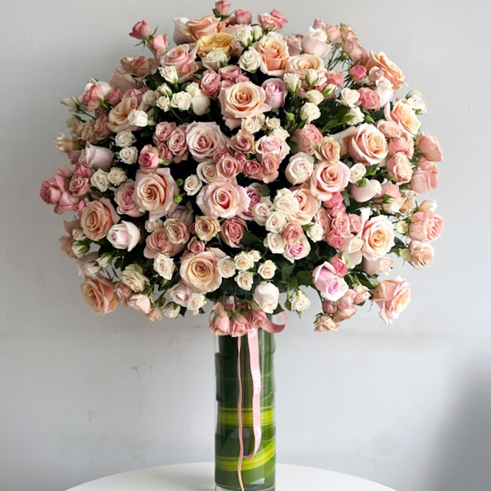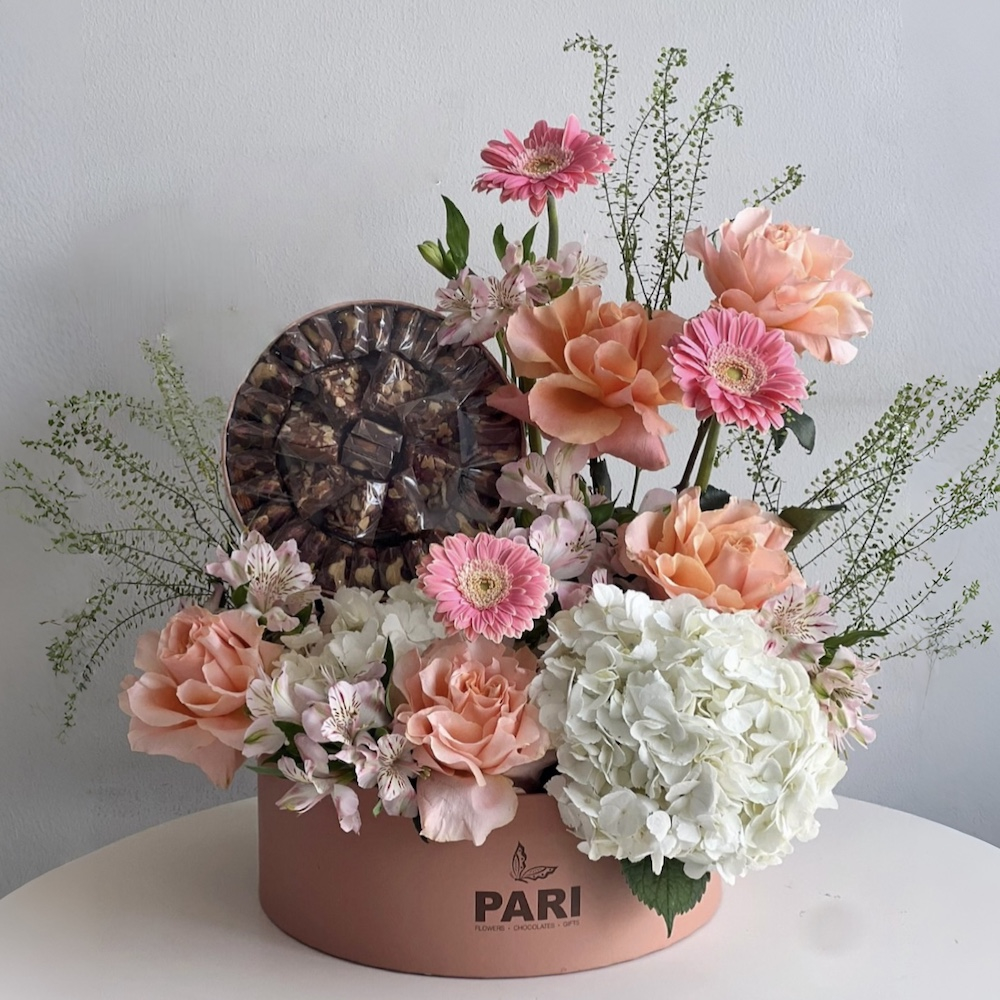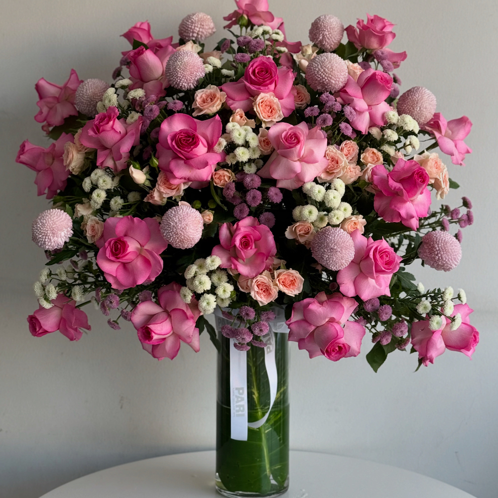 A bouquet that contains deco flowers, chrysanthemums, and roses.