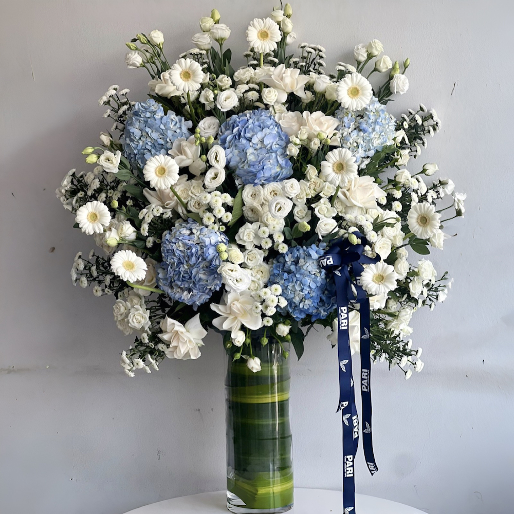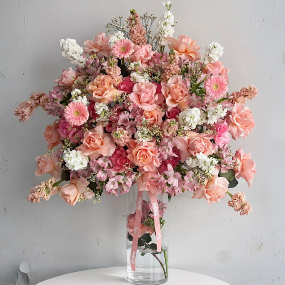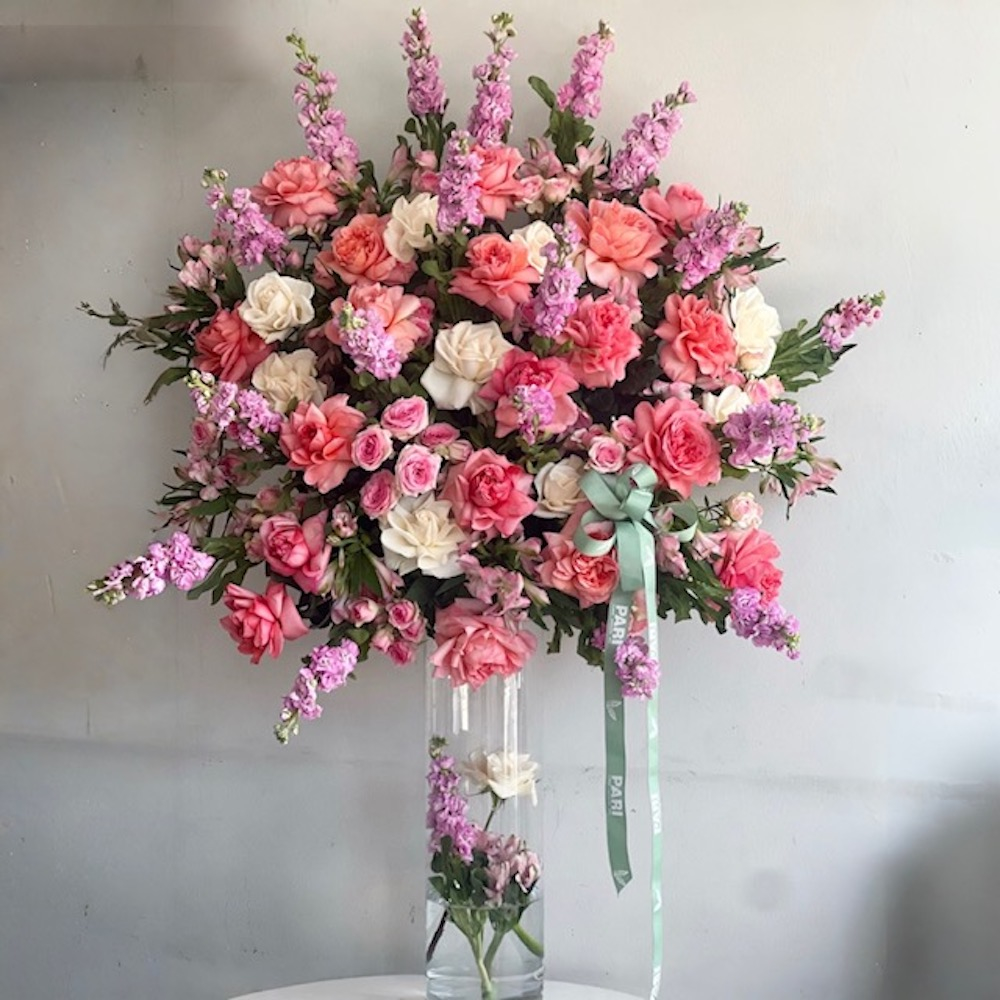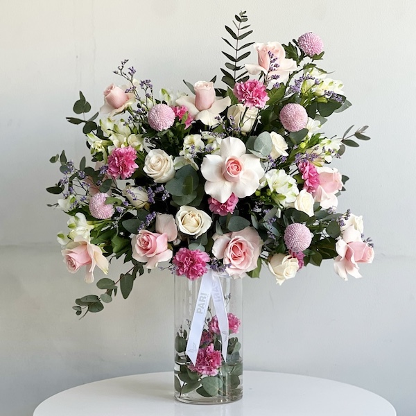 A bouquet that contains deco flowers, chrysanthemums, and roses.