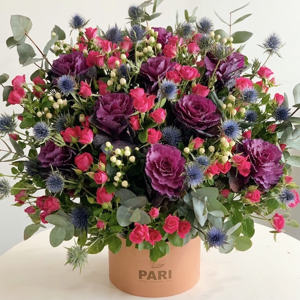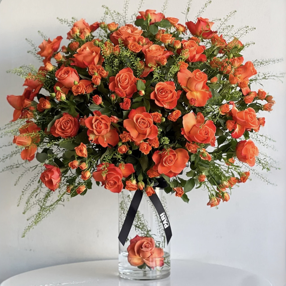 A glass vase beautifully filled with roses, alstroemerias and delphinium.