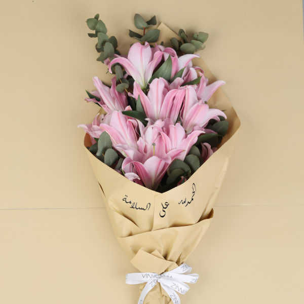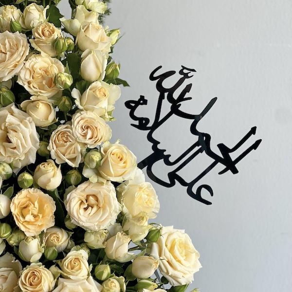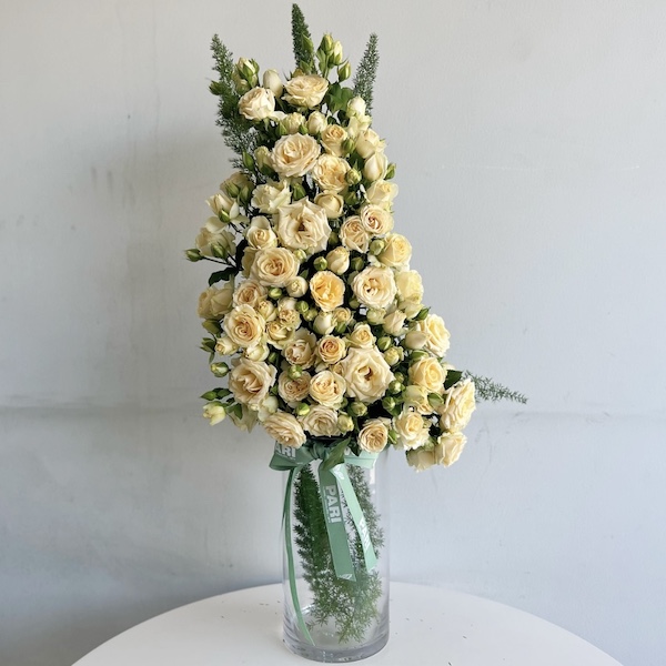 Glass vase topped with spray roses and asparagus leaves.
