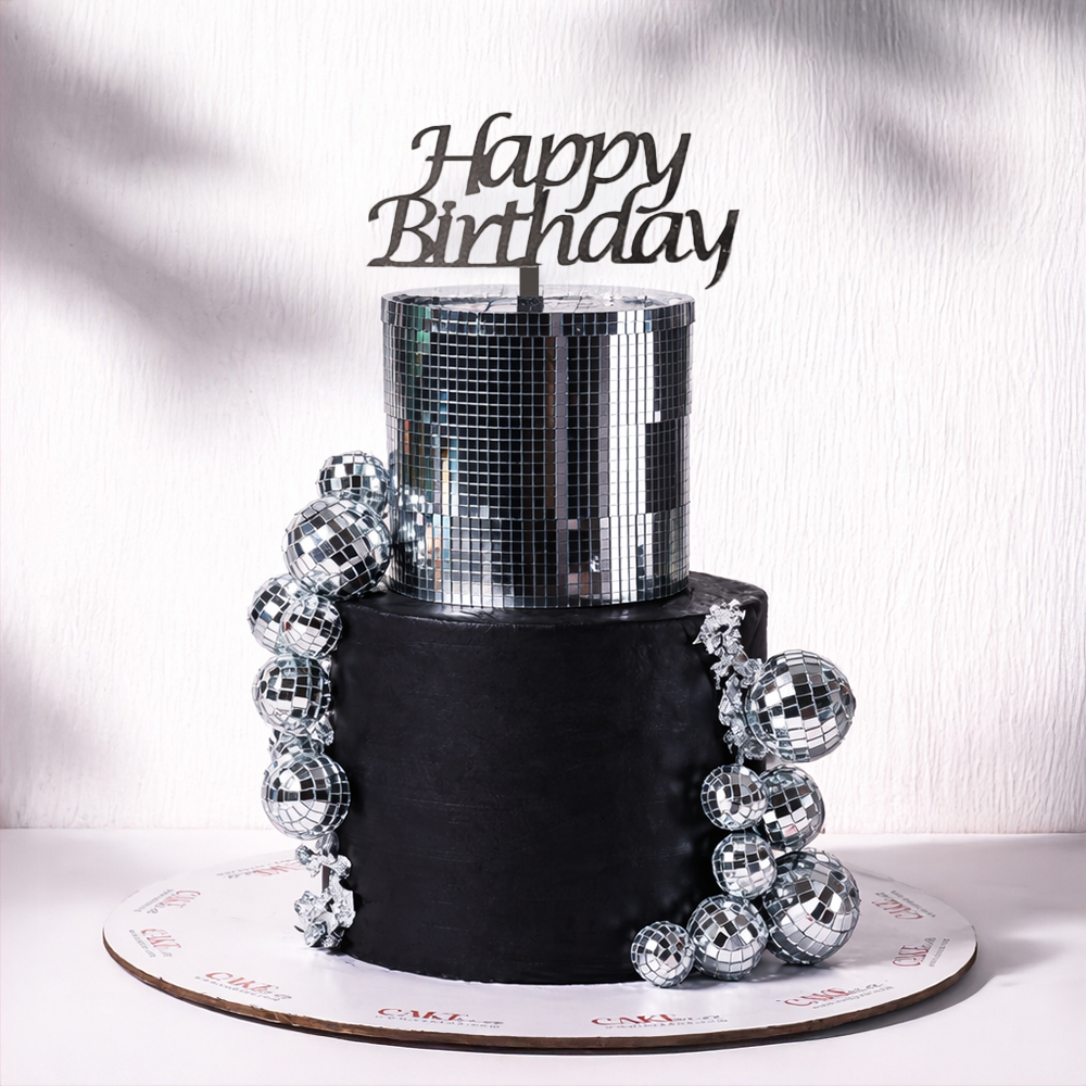 A 2-tier cake in 6-inch and 4-inch sizes, featuring a bold, modern disco-inspired design with a sleek black finish and reflective silver mirror-ball details. Finished with a لاirthday topper, making it a perfect choice for modern birthday celebrations and stylish special occasions. Flavors: chocolate, vanilla, or red velvet (upon request).