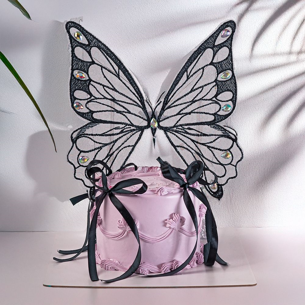 A pastel pink buttercream cake with vintage piping details, adorned with large black butterfly wings embellished with sparkling gems and finished with sleek black satin ribbons. The flavors are chocolate, red velvet, and vanilla, upon your request.