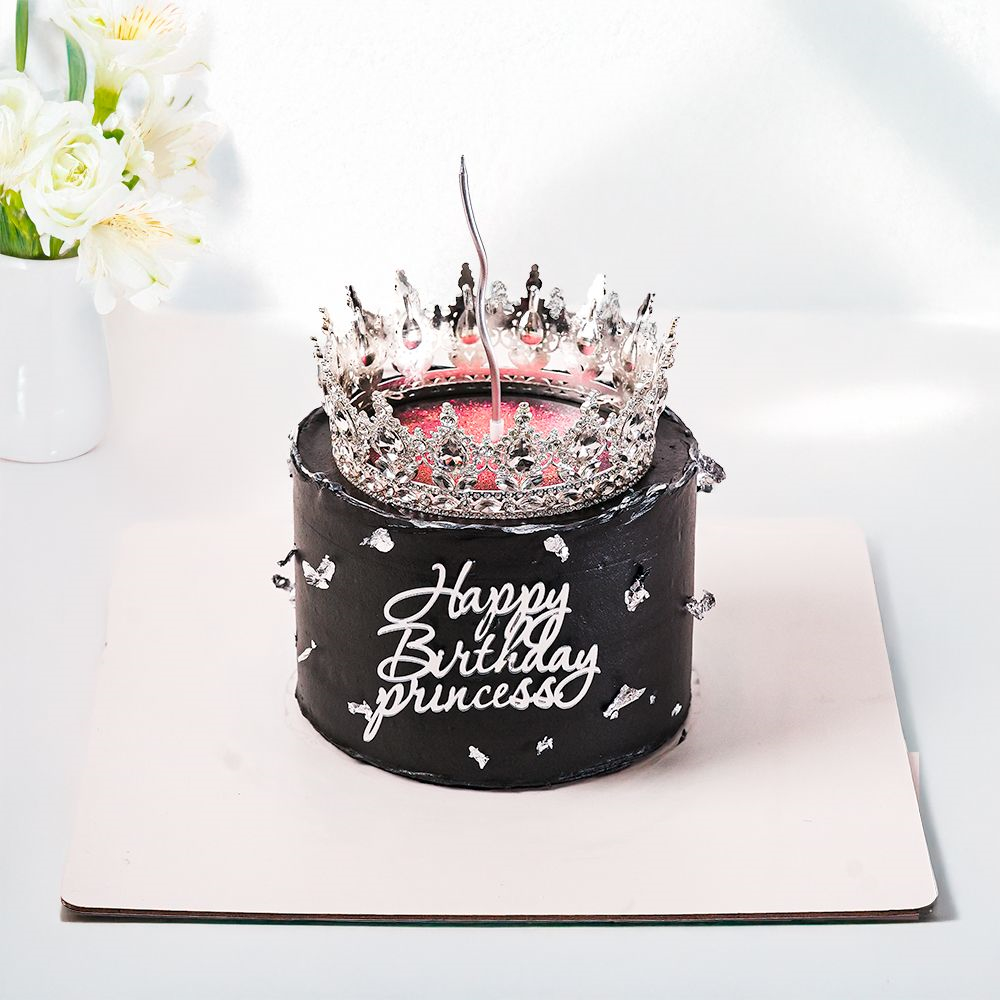 A 6-inch black buttercream cake, accented with silver leaf touches, featuring a shimmering silver crown and the phrase “Happy Birthday Princess” in elegant white script. The flavors are chocolate, red velvet, and vanilla, upon your request.