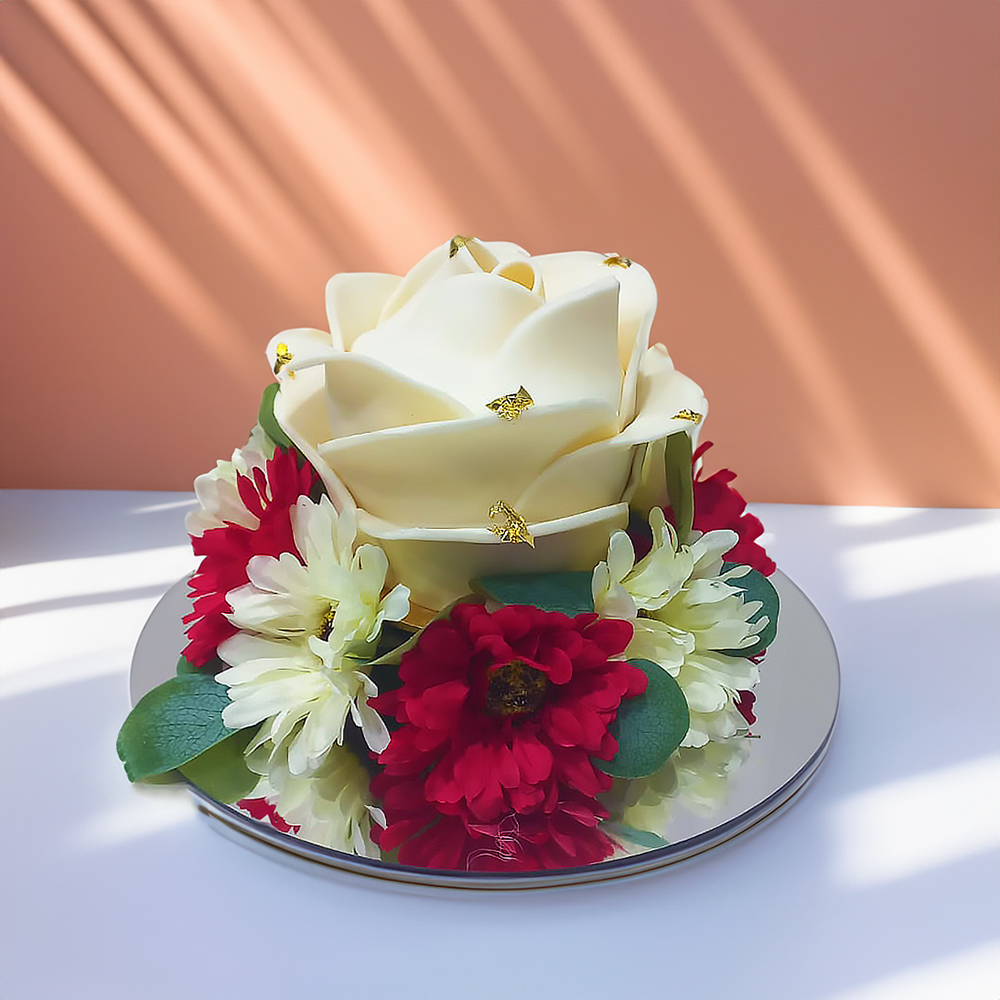 Flower shaped sponge cake surrounded with flowers.