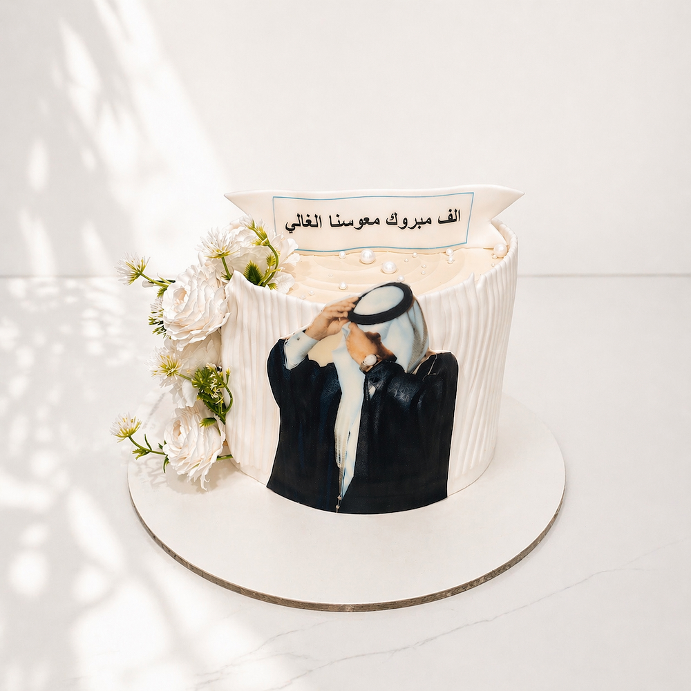 A 6-inch elegant cake with a custom photo and a traditional touch, serving 6–8 people. A refined design, perfect for special occasions.