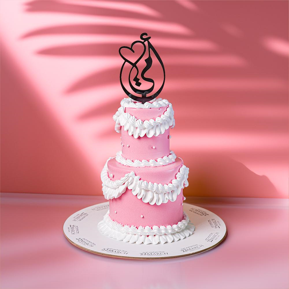 A moist chocolate cake with whipping cream frosting, 6 inches bottom 3 inches top, you can request red velvet or vanilla flavors.