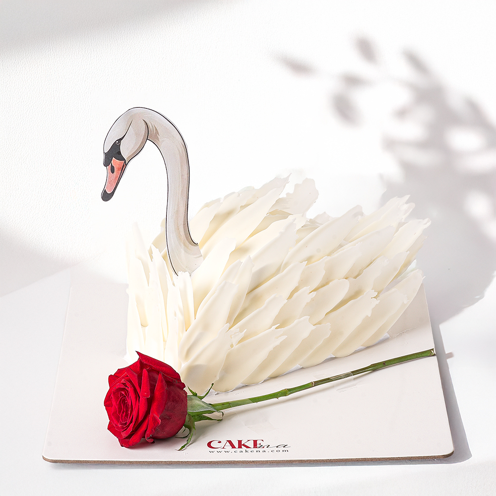 An elegant cake inspired by the beauty of a white swan, designed with layered white chocolate feathers crafted by hand and a printed swan head for a soft artistic look, and it comes with a red rose for an added romantic touch, and it serves 6 to 8 people.