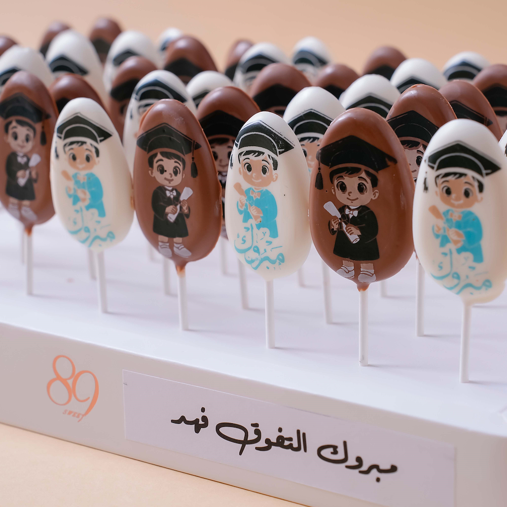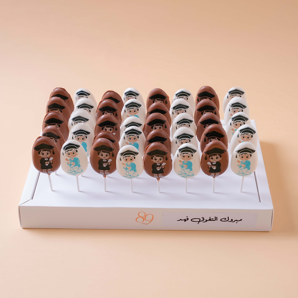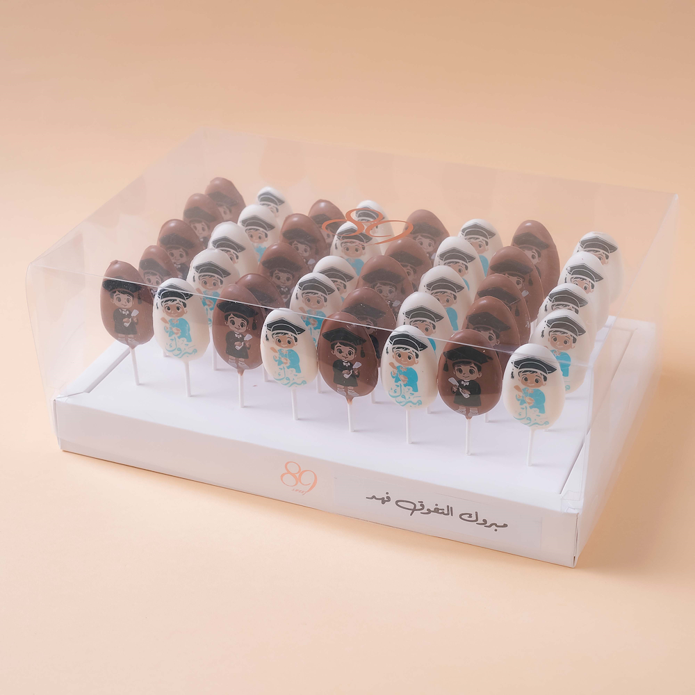 A tray containing 40 lollipops, suitable for a boy's graduation party.