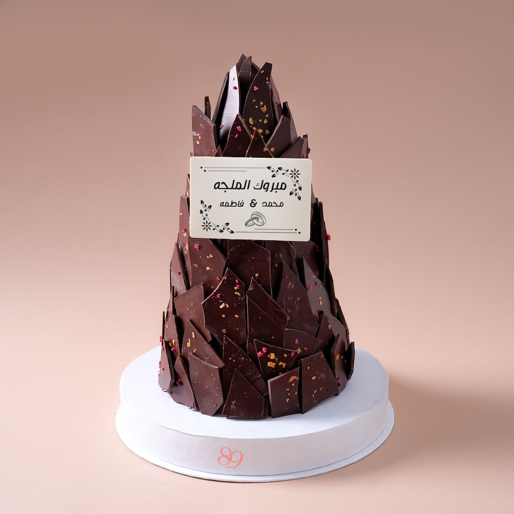 A black chocolate tower weighing 1.3 kg with raspberry garnish.