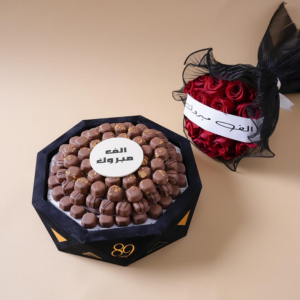 An elegant tray featuring 164 pieces of chocolate fillings with caramel, hazelnut barlinosa, and nutella crunchy, weighing approximately 1 kilo, with a hand bouquet.