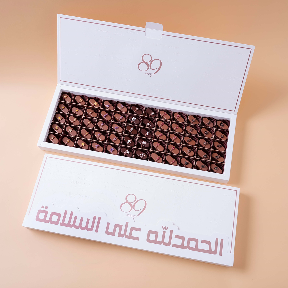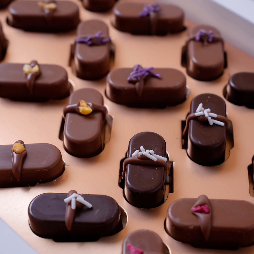 A box containing 60 pieces of chocolate featuring nutella with hazelnut, lotus caramel, coconut, almond, popcorn, and mango berry fillings.