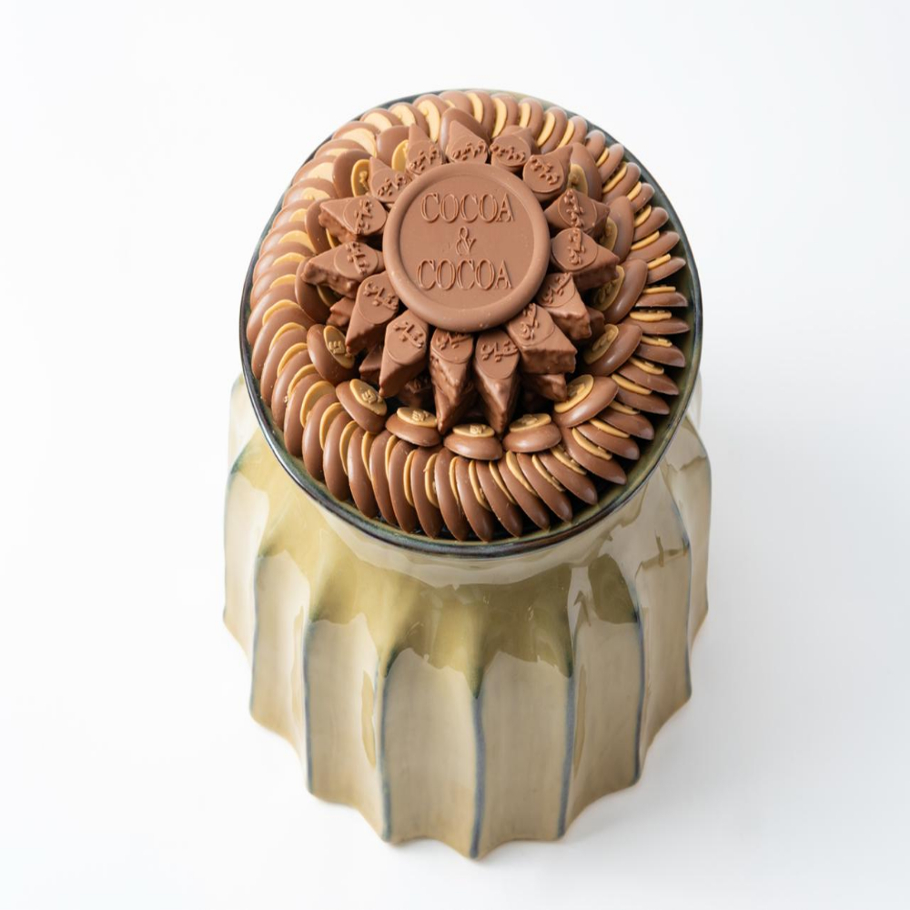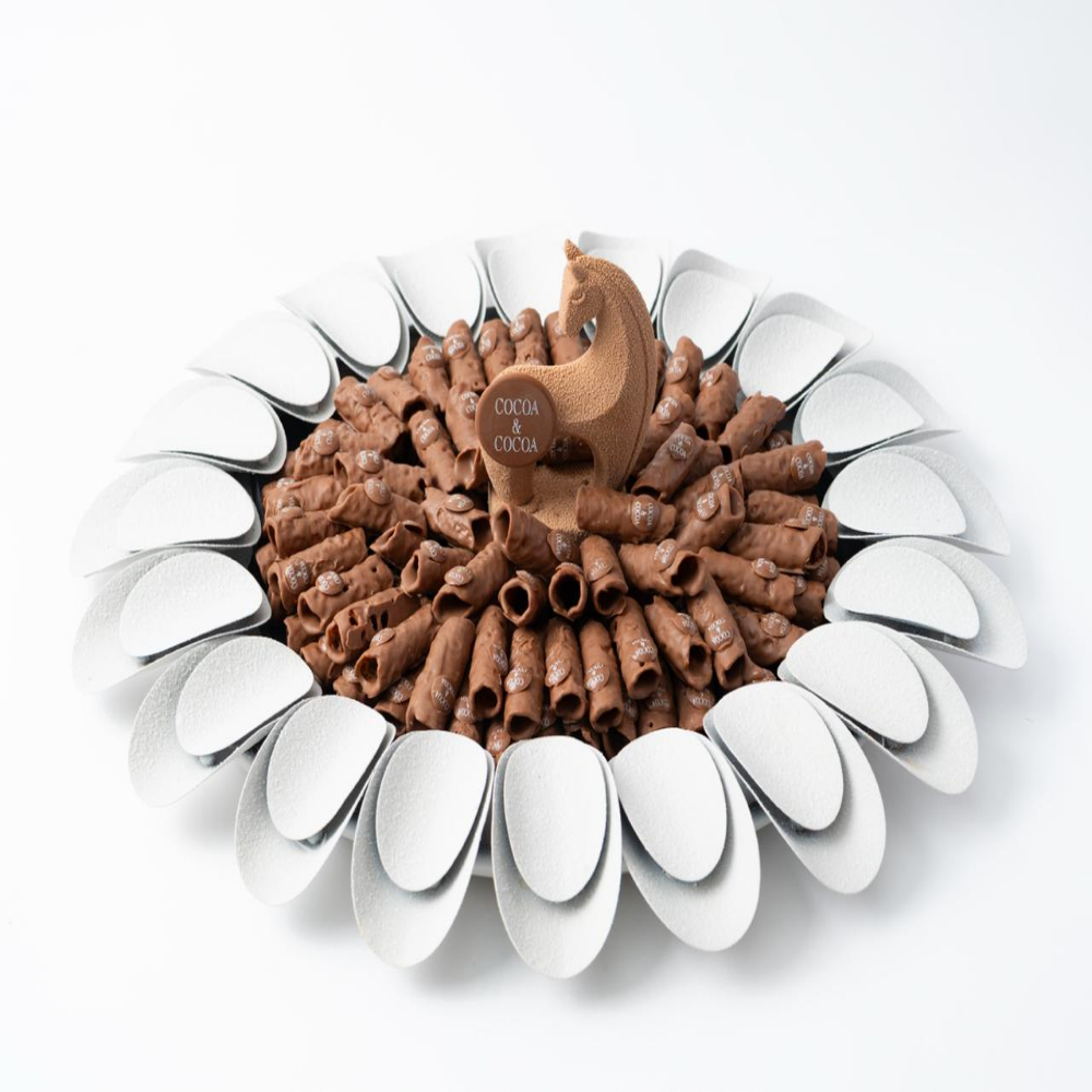 Red velvet cake with petals and 6 roses bouquet with happy birthday greeting.