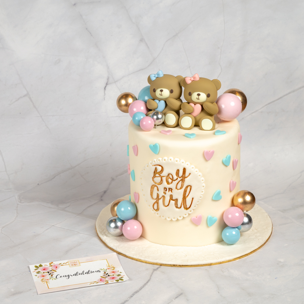 A beautifully designed cake in Chocolate and Vanilla flavors, perfect for celebrating a gender reveal party.