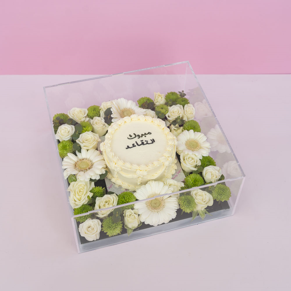 An acrylic tray containing a 4-inch chocolate bento cake, decorated with a mix of flowers.