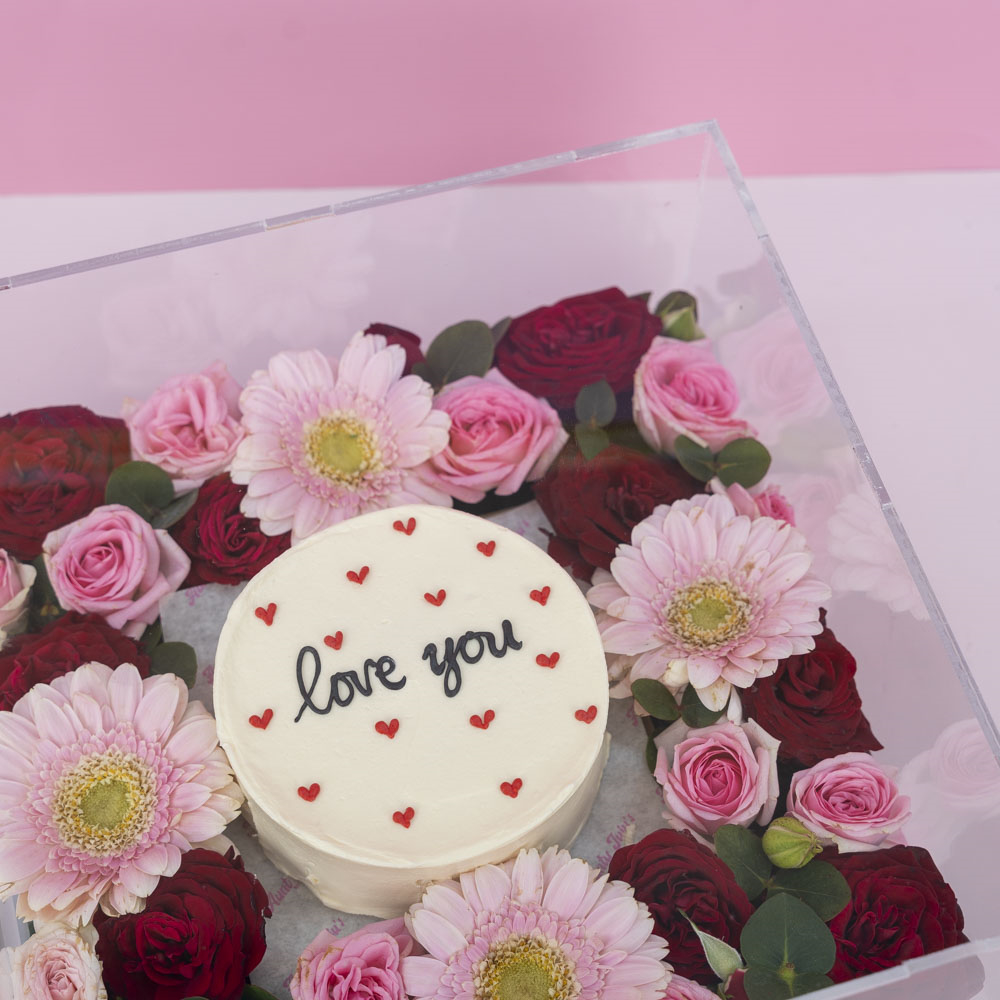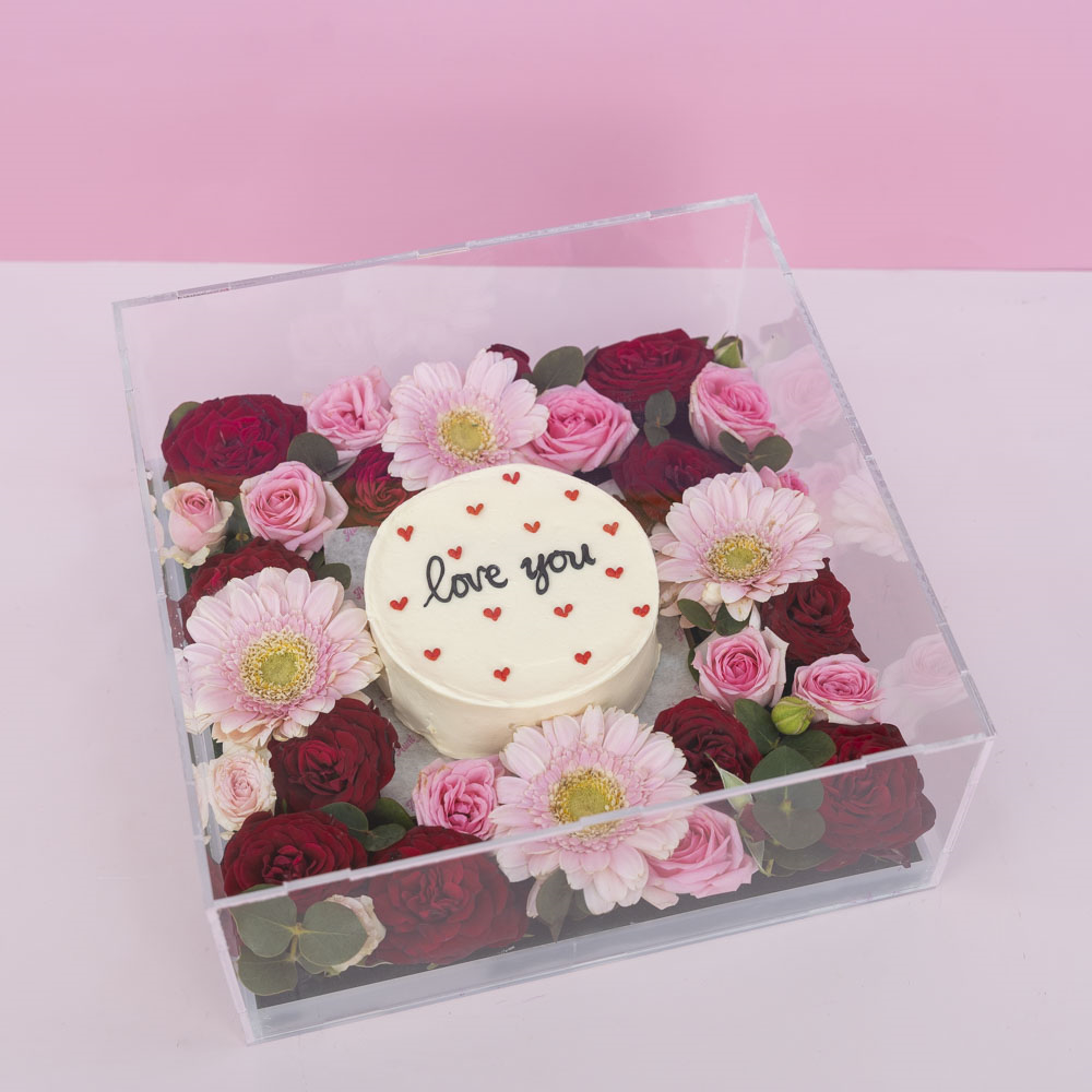 An acrylic tray containing a 4-inch chocolate bento cake, decorated with a mix of flowers.