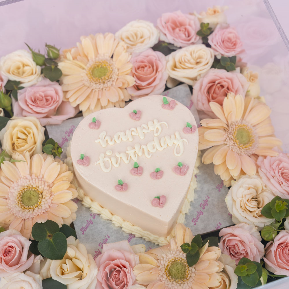 An acrylic tray containing a 4-inch chocolate bento cake, decorated with a mix of flowers.