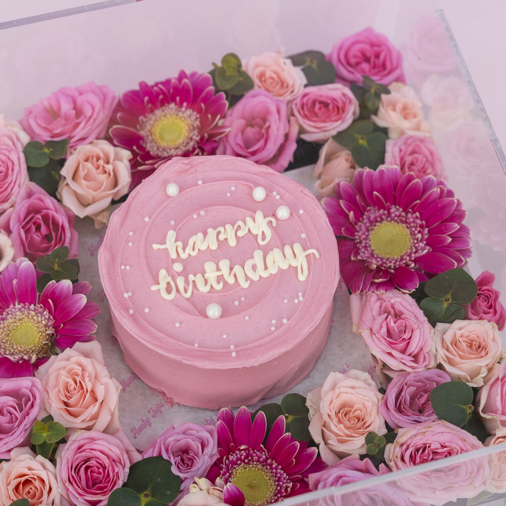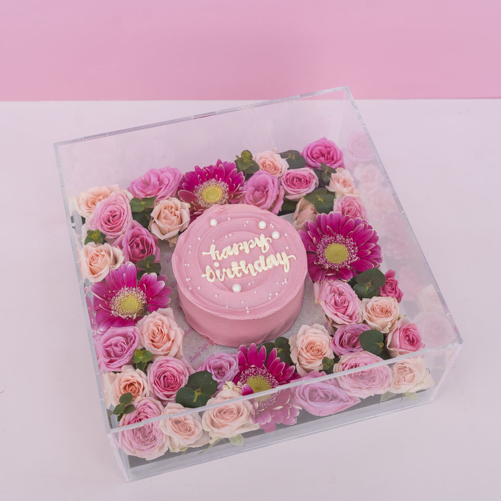 An acrylic tray containing a 4-inch chocolate bento cake, decorated with a mix of flowers.