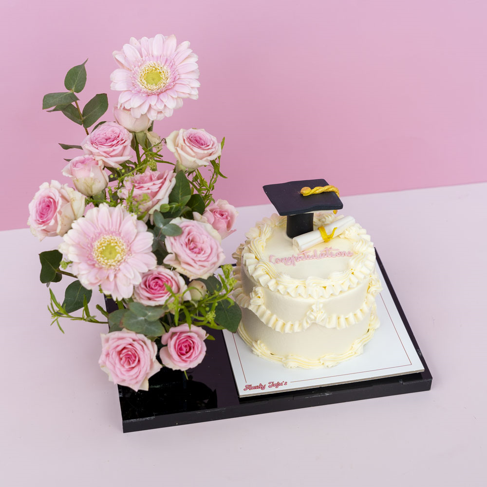 An acrylic tray containing a 4 inch chocolate bento cake, decorated with a mix of flowers.