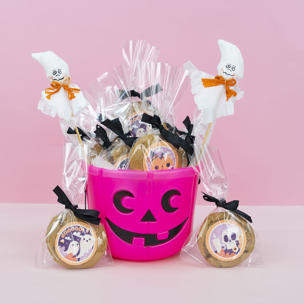 A Halloween basket that contains 10 pcs of chocolate chip flavored cookies.