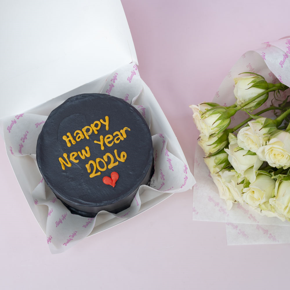 A delicious 4-inch chocolate bento cake, enough for 2 people, served in a carton box. Comes with a bouquet of roses.