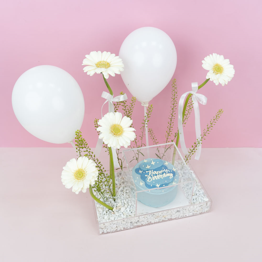 An acrylic tray contains 4-inch chocolate bento cake, with 4 gerberas and 2 balloons.