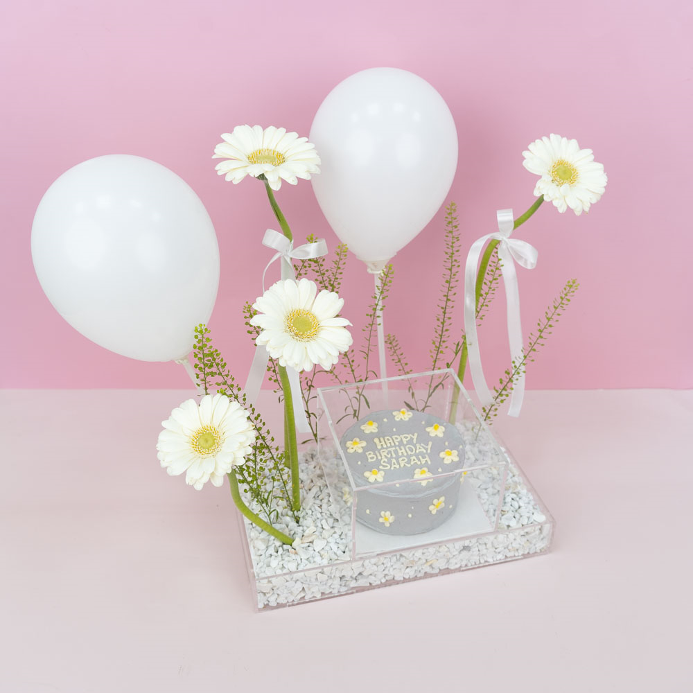 An acrylic tray contains 4-inch chocolate bento cake, with 4 gerberas and 2 balloons.