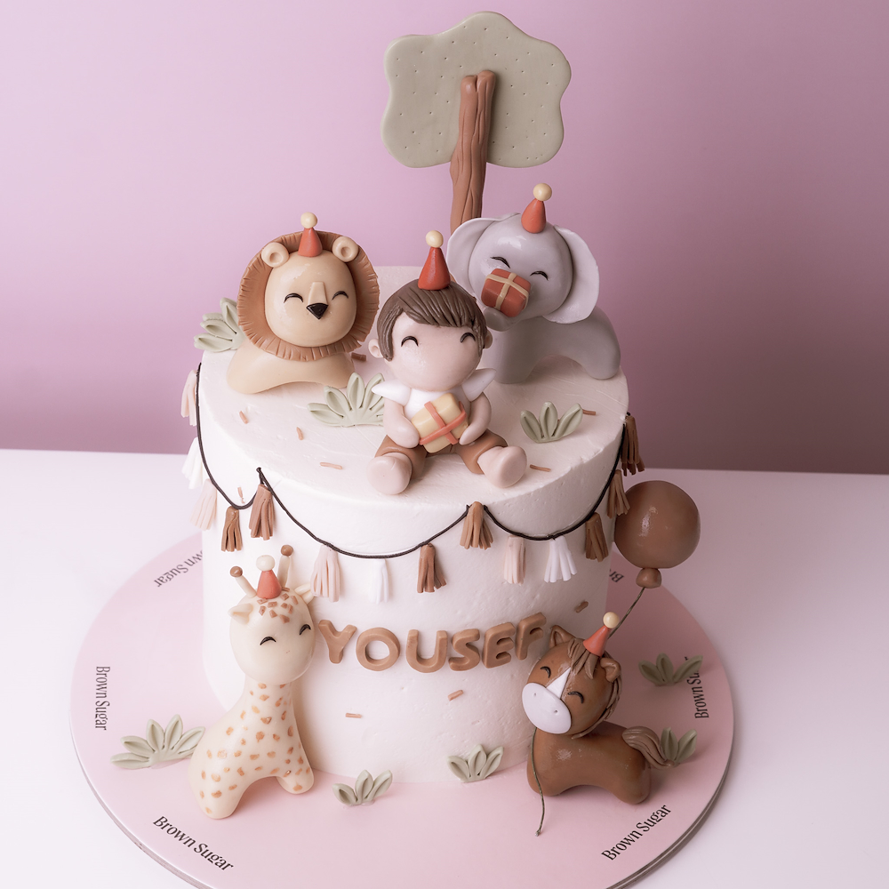A charming safari-themed cake featuring handcrafted animal toppers and a playful boy centerpiece. Perfect for kids’ birthdays and jungle-themed celebrations. The cake flavors are chocolate and vanilla.