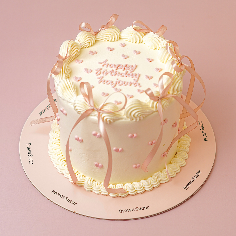 A soft layered cake covered in smooth vanilla buttercream, decorated with delicate piping and hand tied satin ribbons, elegant, minimal, and perfect for celebrations.