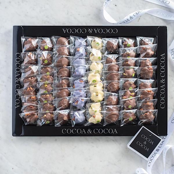 A glass tray filled with 650g of samsamia: lotus, pistachio, and strawberry.