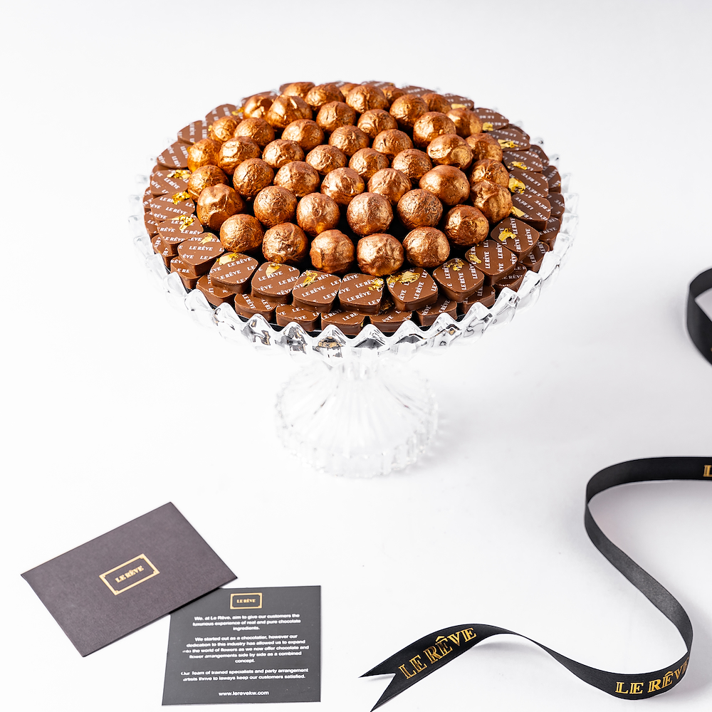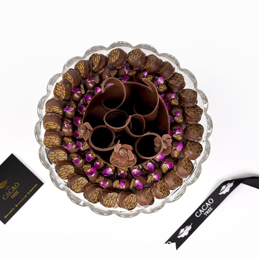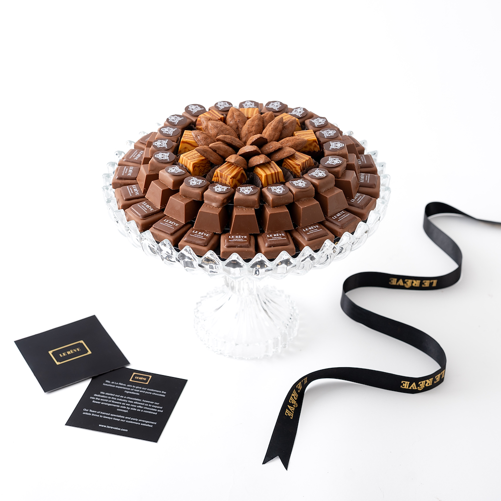 A crystal tray contains 750 grams of chocolate with chocolate art in the middle.