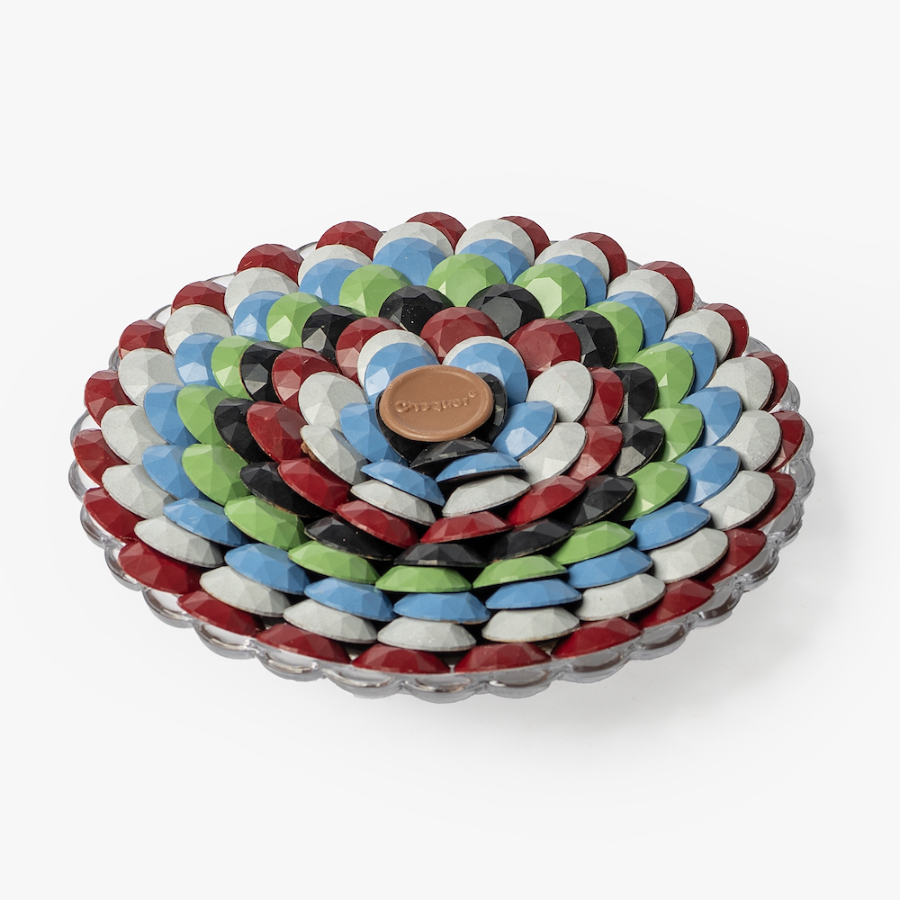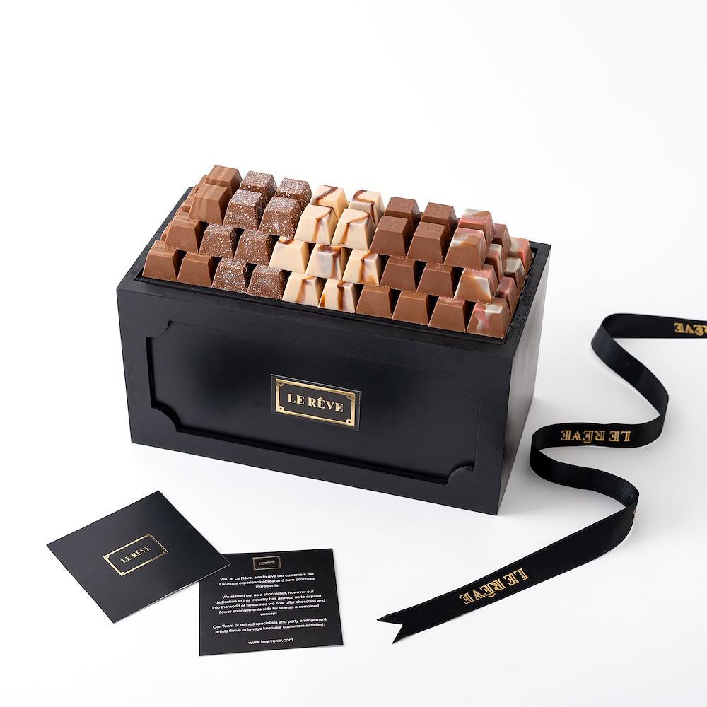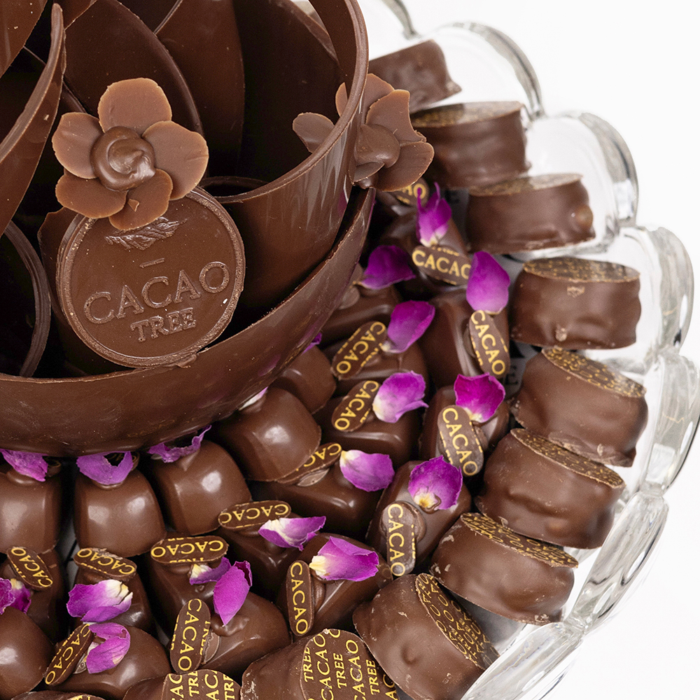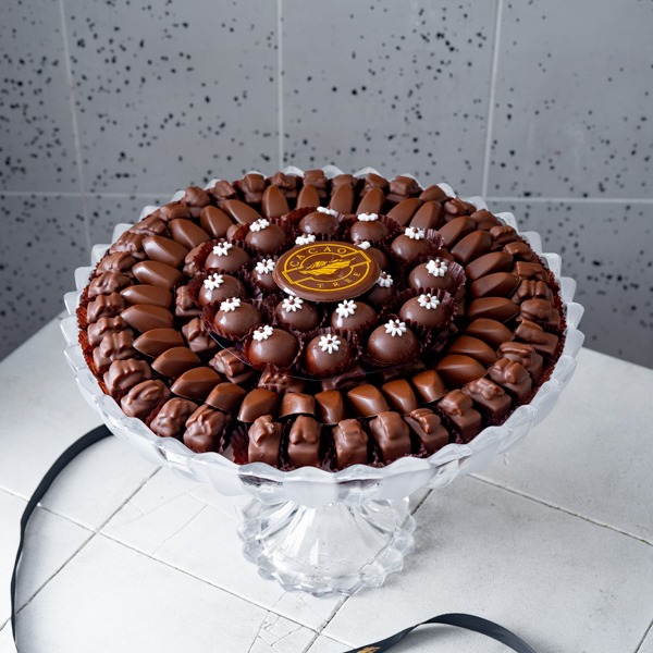A crystal tray contains 750 grams of chocolate with chocolate art in the middle.