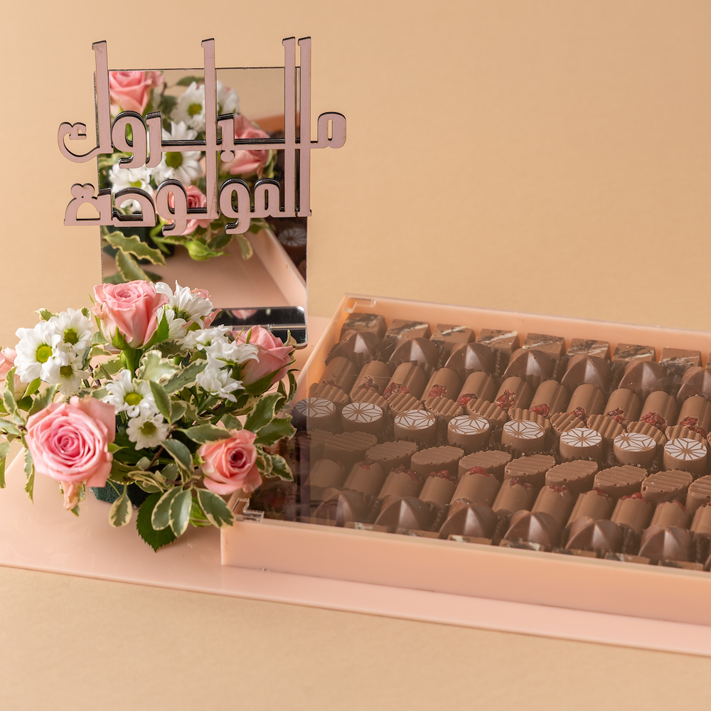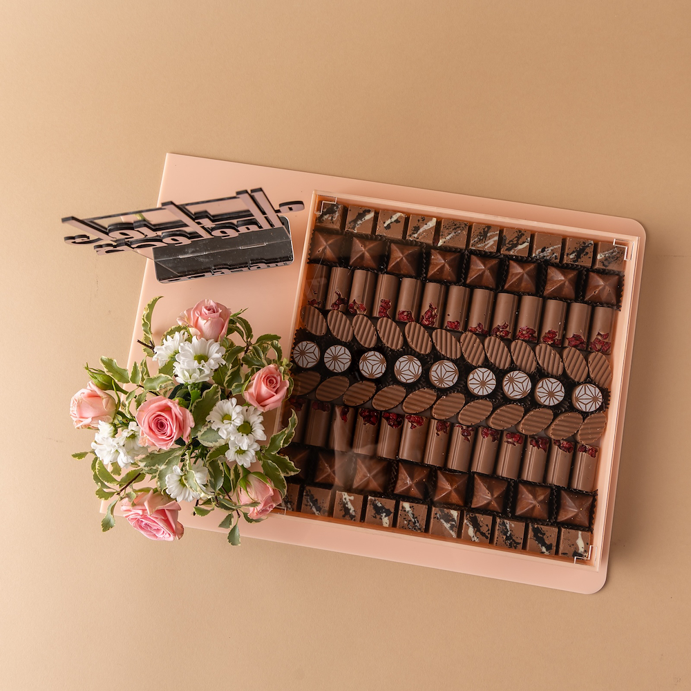 A refined pink acrylic box adorned with fresh flowers and filled with premium chocolates, featuring an elegant wooden “Congratulations on the Baby Girl” sign an exquisite gift to celebrate the arrival of a newborn princess.
