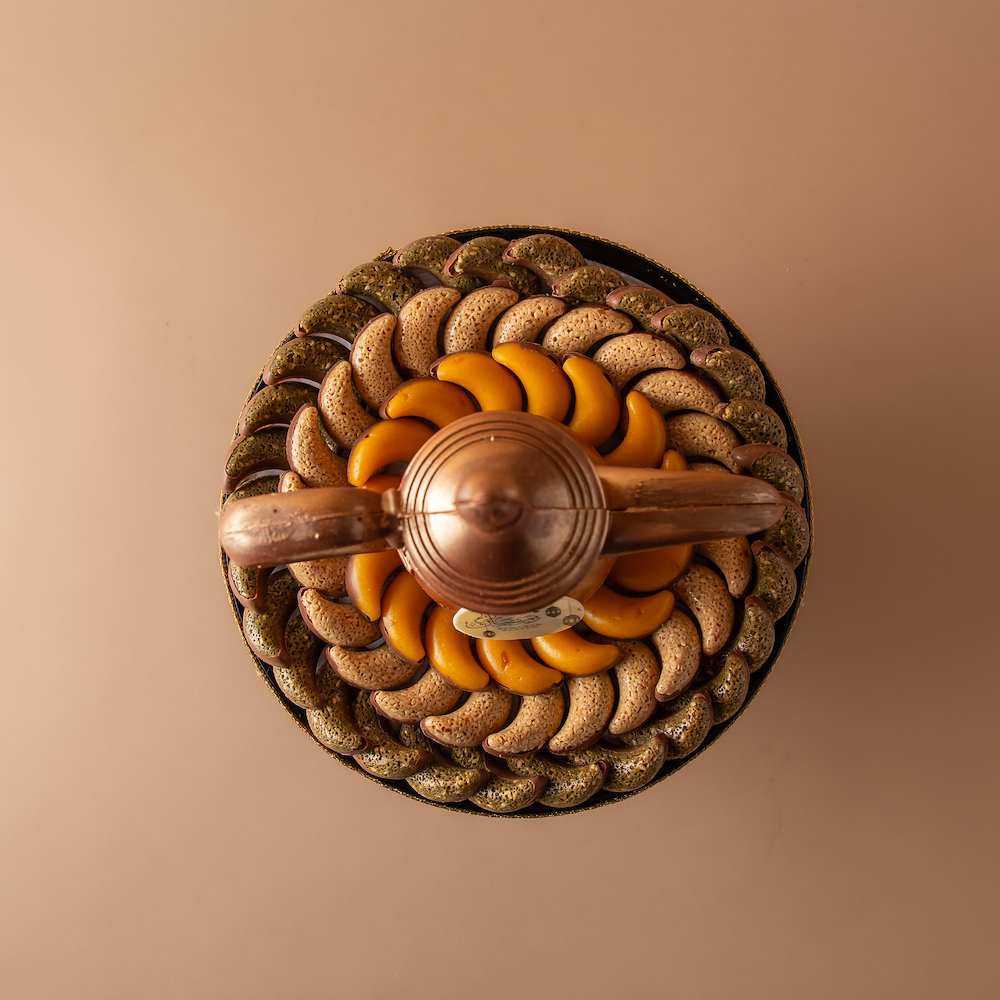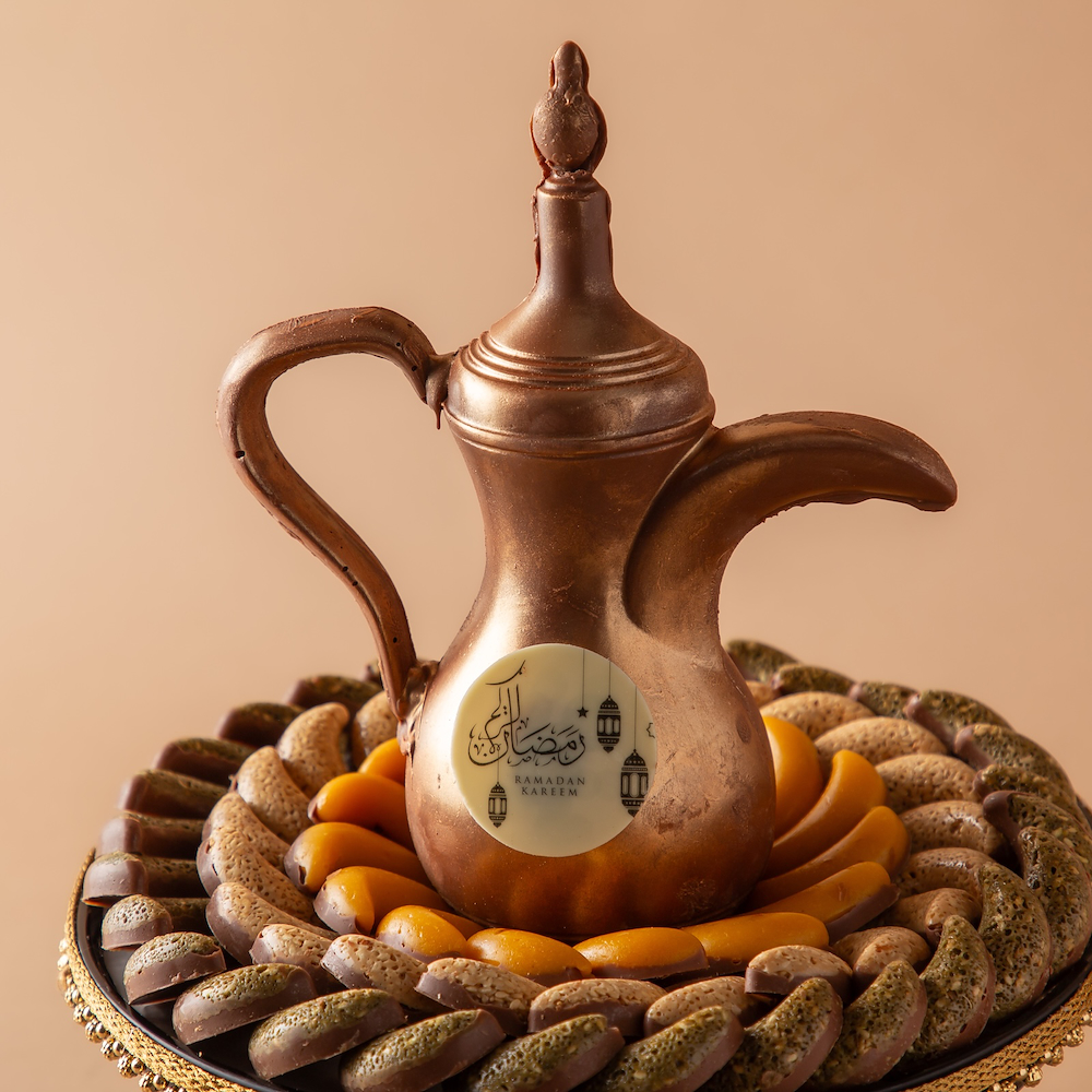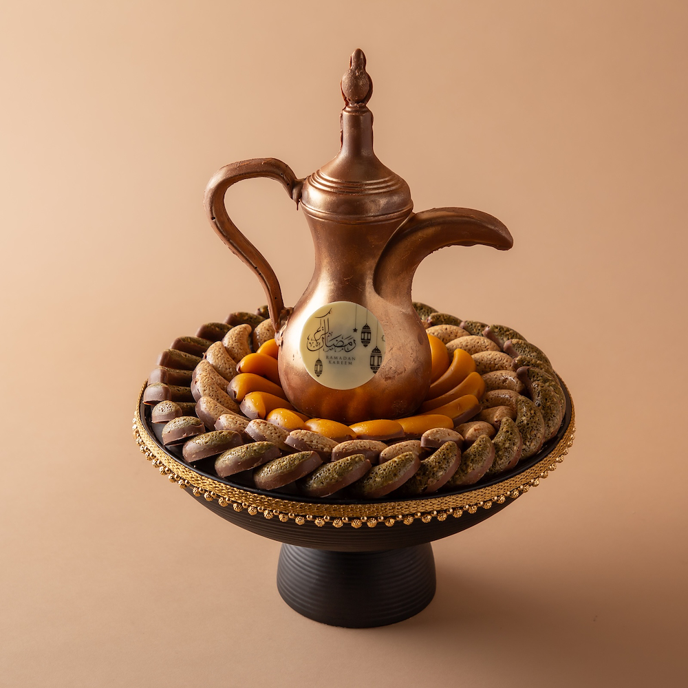 A luxurious black vase adorned with an Arabic coffee cup made entirely of chocolate. Contains 965 grams of premium chocolate, offering a refined and unique gift experience for coffee and chocolate lovers.