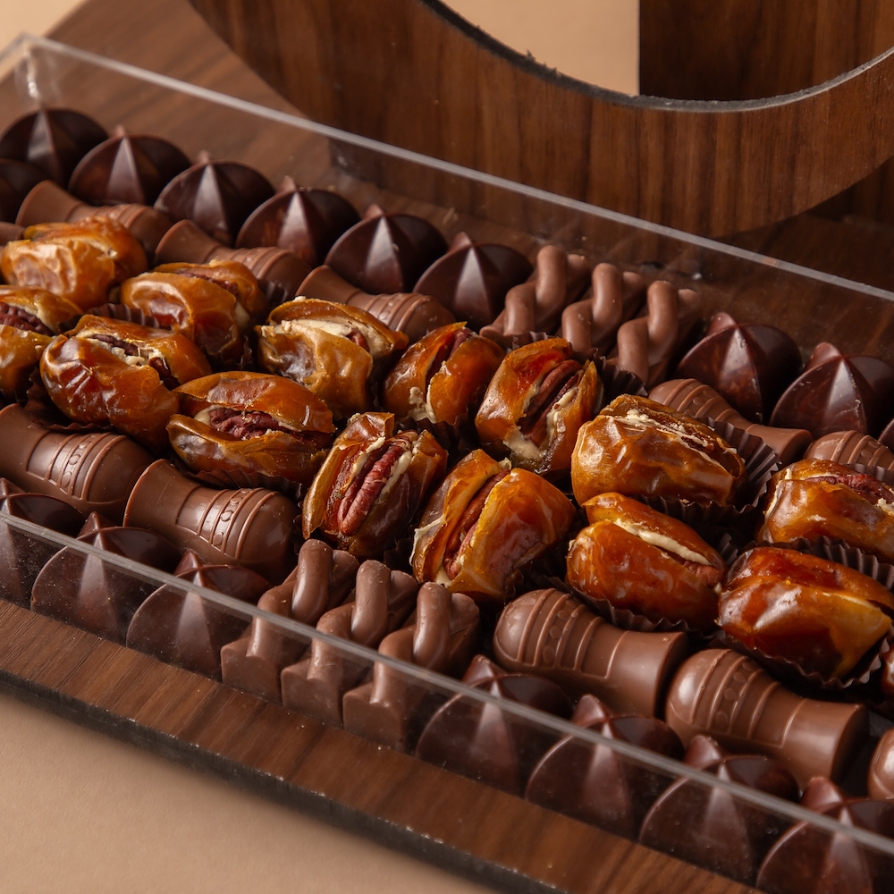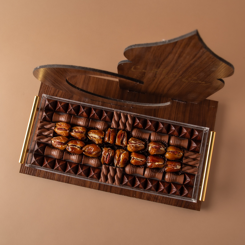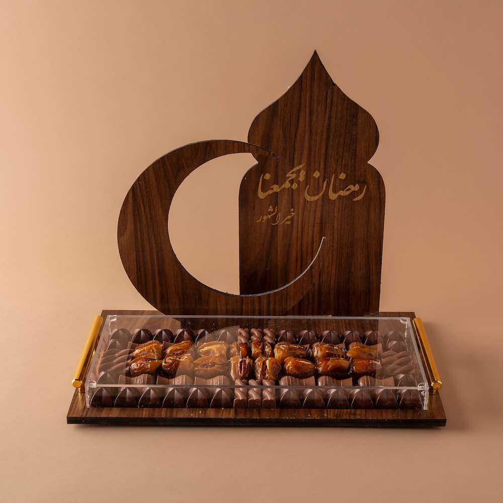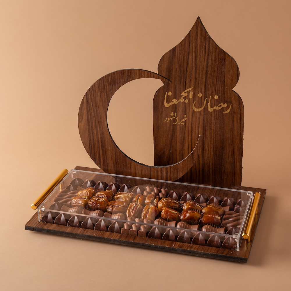 An elegant wooden stand featuring a Ramadan themed phrase, designed to combine traditional charm with luxury, contents: premium chocolate, stuffed dates (ruhash) walnuts.