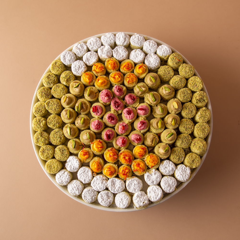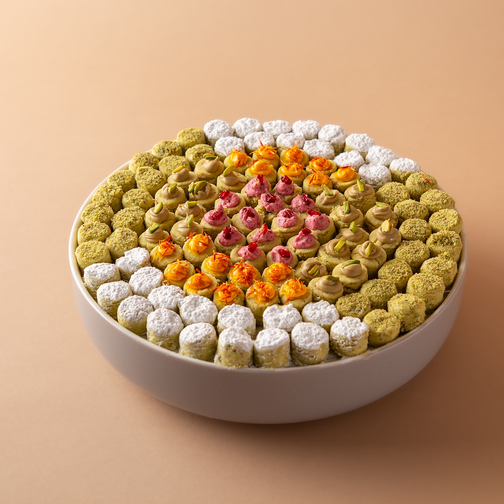 A ceramic tray containing 0.600 kg of Ghuraybeh in assorted flavors.