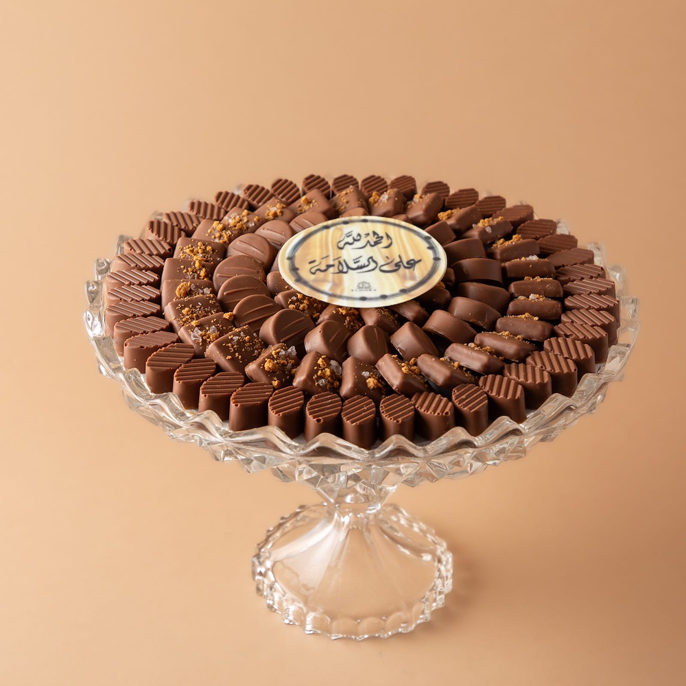Elegant acrylic box with the phrase “Alhamdulillah Ala Alsalama,” includes: premium chocolates neatly arranged, fresh yellow flowers for a cheerful touch A classy design, perfect as a get-well gift, a thoughtful and elegant way to say “Glad you’re safe.”